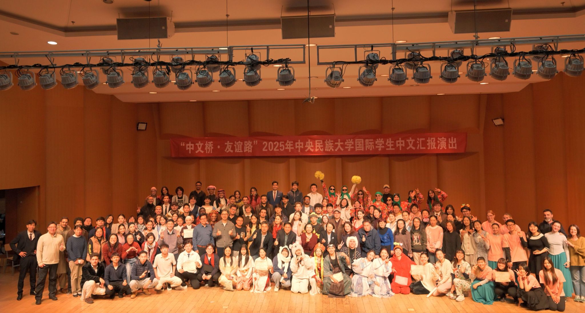 2025年12月29日下午,“中文桥·友谊路”——2025年中央民族大学国际学生中文汇报演出在海淀校区中慧楼音乐厅隆重举行。来自41个国家的国际学生以中文为桥,通过情景剧、小品、歌舞等形式,展现了中文学习成果与跨文化风采。教务处副处长高志强、保卫处副处长庞建超、众赢国际版