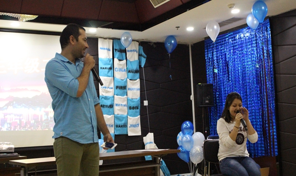 最后是由两位来自泰国的女学生带来的英文歌曲。两位同学熟练地谈奏着吉他和钢琴,强烈的节奏瞬间感染到了大家,全场气氛顿时热烈,将晚会推向了另一个高潮。