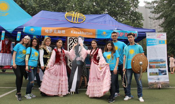 在各国文化展示区,蒙古、越南、美国、日本、印度尼西亚、刚果布、吉尔吉斯斯坦、缅甸、韩国、哈萨克斯坦、土耳其、突尼斯、塔吉克斯坦、泰国、柬埔寨、乌兹别克斯坦和法国十七个国家的学生设置了各自国家的展台。他们身着本国传统服饰,不断向众多参观者进行着讲解和互动。学生们精心准备了文字介绍、特色美食和精美手工艺品小礼物,向前来参观的师生展示着自己国家和民族的语言、风情和文化。蒙古学生带来了精致的马鞍和现场书法,柬埔寨同学准备了精巧的钥匙链,泰国同学设计了套圈赢特色饮品的游戏,日本学生手把手教你玩传统的剑球游戏,刚果布同学敲响了非洲鼓吹响了嘹亮的号角……各国学生亲手制作的美食最被热情的参观者追捧。今年首次推出的文化节护照不到一个小时也被一抢而光。