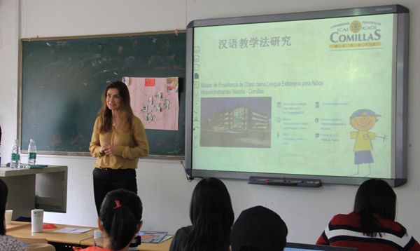 讲座主题为“西班牙儿童汉语教师硕士项目及西班牙汉语教学概况”。讲座主要分为两部分:第一部分介绍了“西班牙儿童汉语教师硕士项目”的课程安排及申请要求,第二部分享了一些有关“西班牙汉语教学情况及教学方法”的经验。首先,赵晶丽老师介绍了西班牙儿童汉语教师的硕士课程安排与主要课程内容——儿童心理学、课堂规划、汉语教学资源、中西方文化比较及幼儿园、小学、初中汉语教学等。此外,还介绍了该校汉语教师硕士项目申请的专业要求、语言要求与入学材料等。接下来,Sole Amián老师展示了西班牙汉语教学的图片、视频,并现场模拟汉语教学。从中,学生们不仅感受到了当地的教学环境与氛围,也学到了如何在汉语课堂综合运用多种教学方法——图片法、故事教学法、任务型教学法、全身反应法等。
