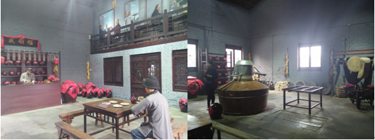 留学生的参观活动从下午两点正式开始,酒厂的一名讲解员带领留学生参观了酒厂。首先,她给留学生介绍了古代的造酒图,造酒图展示了牛栏山从烧锅到酿酒所使用的原料,以及酿酒、品酒和收酒的热闹场面。酒厂的走廊两侧有七个雕刻的人物,每个人都有自己不同的工作,展现了烧酒的主要流程。然后,留学生去牛栏山展厅参观了古老的盛酒器具。下面两幅图,左边再现了以前酒馆的真实场景,右边是烧酒的老烧锅。古时候,烧酒都是用柴来加热的。烧酒时,第一锅的酒杂汽比较重,第三锅的酒水汽比较重,只有第二锅的酒口感品质是最好的,所以也叫二锅头。