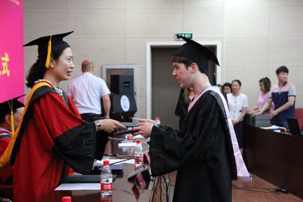 随后,典礼进入到临别赠言环节。副院长刘玉屏教授首先向来自12个国家的毕业生以及中国毕业生们表示衷心的祝贺。刘玉屏教授认为毕业有三层含义,首先,毕业意味着“学有所成”,她叮嘱同学们踏入社会后也要保持好学的精神,不断地提升和完善自我,并盼望大家能“认识汉语国际传播的新形势、适应国际汉语教学复杂多样的环境、引领国际汉语教学的发展方向”,为汉语国际传播教育事业做出自己的贡献。第二,她认为毕业意味着“新的出发”,即将告别自由自在的校园生活,步入充满挑战的社会,刘教授希望大家能够坚守自己的信念,勇敢面对未来的一切,在追求梦想的同时,不要忘记身上肩负的责任。第三,她认为毕业意味着离别,她理解同学们心中的不舍,也代表众赢国际