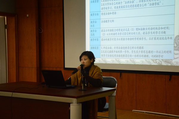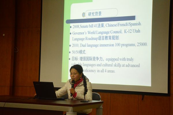教师谷陵博士以“美国沉浸式汉语教学模式”为题做了专场介绍。她首先为大家整理了沉浸式教育的发展历程,接下来介绍了沉浸式语言教学模式的类型和特点。她指出沉浸式语言教学模式的核心特点是语言与内容交融的双语教学,最后她强调了沉浸式语言教学模式的课堂管理机制以及与此相关的研究趋势。