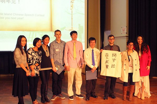 2014年11月,主持(右一)罗德岛地区大学生演讲比赛,中间是部分获奖学生