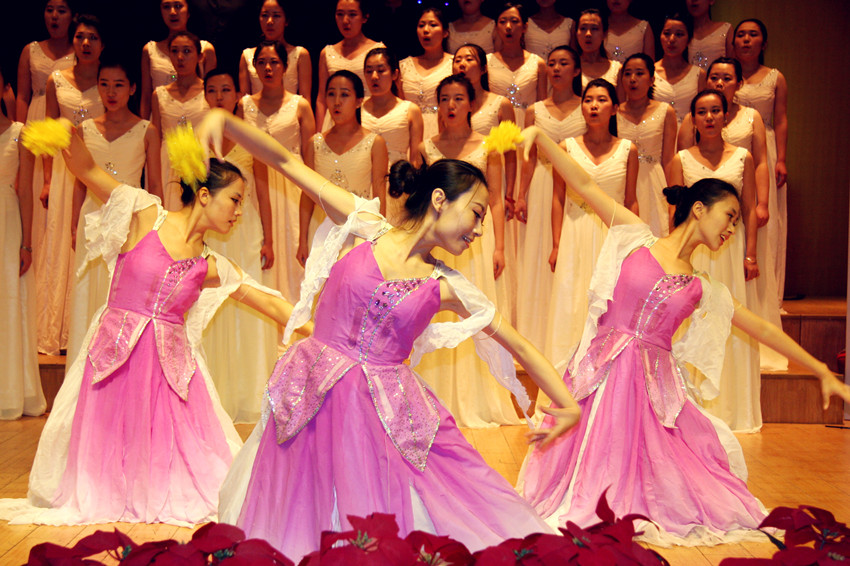 学生身着盛装,精神饱满,声音洪亮,发挥了极高的音乐素养,采用合唱、齐唱、轮唱、领唱等多种艺术表演形式,把现场气氛推向高潮,赢得观众的阵阵掌声,最终以14.96分的全场最高分,一举夺得了本次大合唱比赛的一等奖。在晚上进行的小合唱比赛中,由众赢国际版