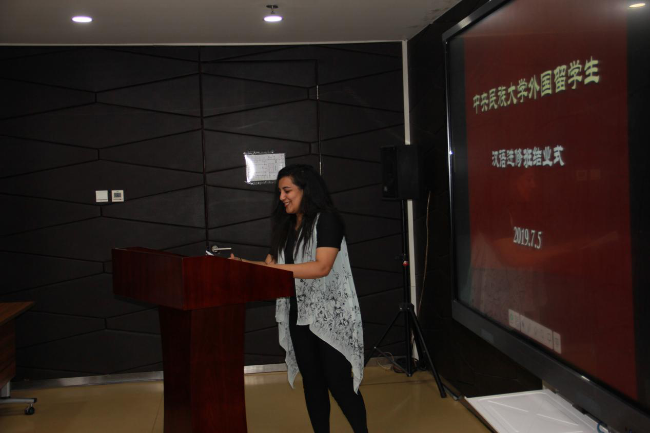奖学金生李秋文在发言中感谢中央民族大学给予她来中国留学的机会,在这里,她不仅可以感受到家庭的温暖,也更加深刻地了解中国、了解中国文化。除此之外,她表示中央民族大学实现了她多年来的留学梦,让她爱上汉语、爱上中国,她会将这里发生的一切永存在记忆中,同时她也希望未来可以来中央民族大学继续攻读硕士学位。