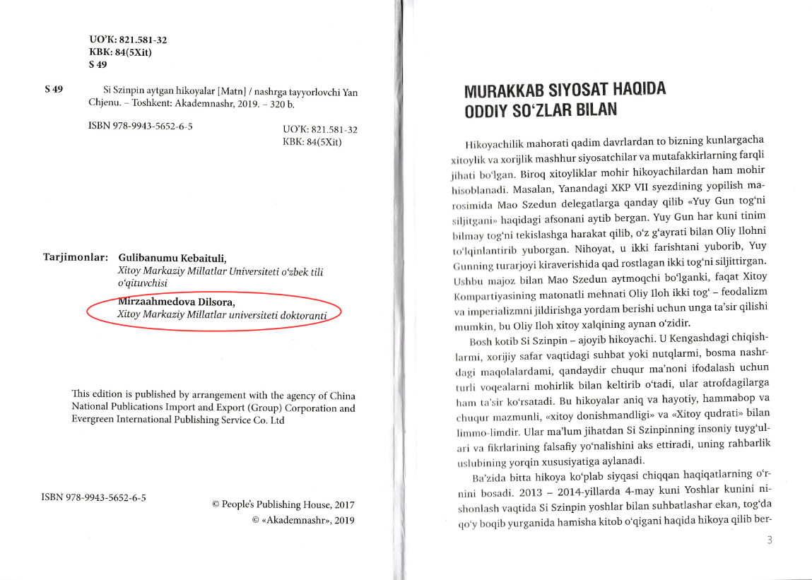 博士生吉莉(Mhzaahmedova Dilsora)(师从吴应辉教授)参与了该书翻译,她本人还因此获得由国家汉办和中图公司提供的“孔子新汉学计划”青年领袖项目多语种翻译研修机会,参与该书翻译的还有中央民族大学乌兹别克语教师古丽巴努尔·克拜吐里(Gulibanumu Kebaituli),高层次语言人才正为中乌两国人文深层交流提供有力保障。