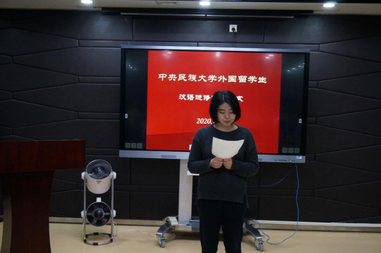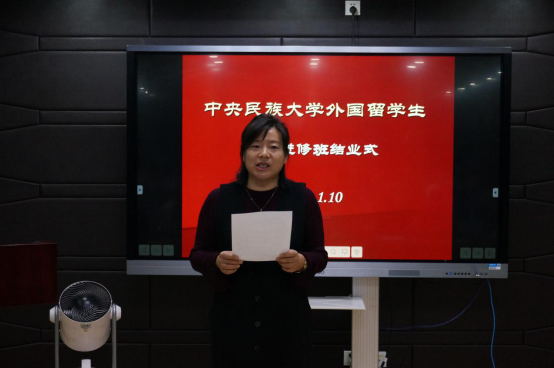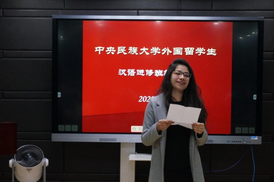 语言生教研室副主任张璟老师作为教师代表发言。她感谢大家这四个月在学习和活动上的辛苦付出,感谢大家积极主动去了解彼此的文化,感谢大家努力成为彼此珍贵的回忆。她还说道,大家已经是民大的一员,已经在这里留下了属于你们的青春足迹,希望大家以后有机会常回家看看。