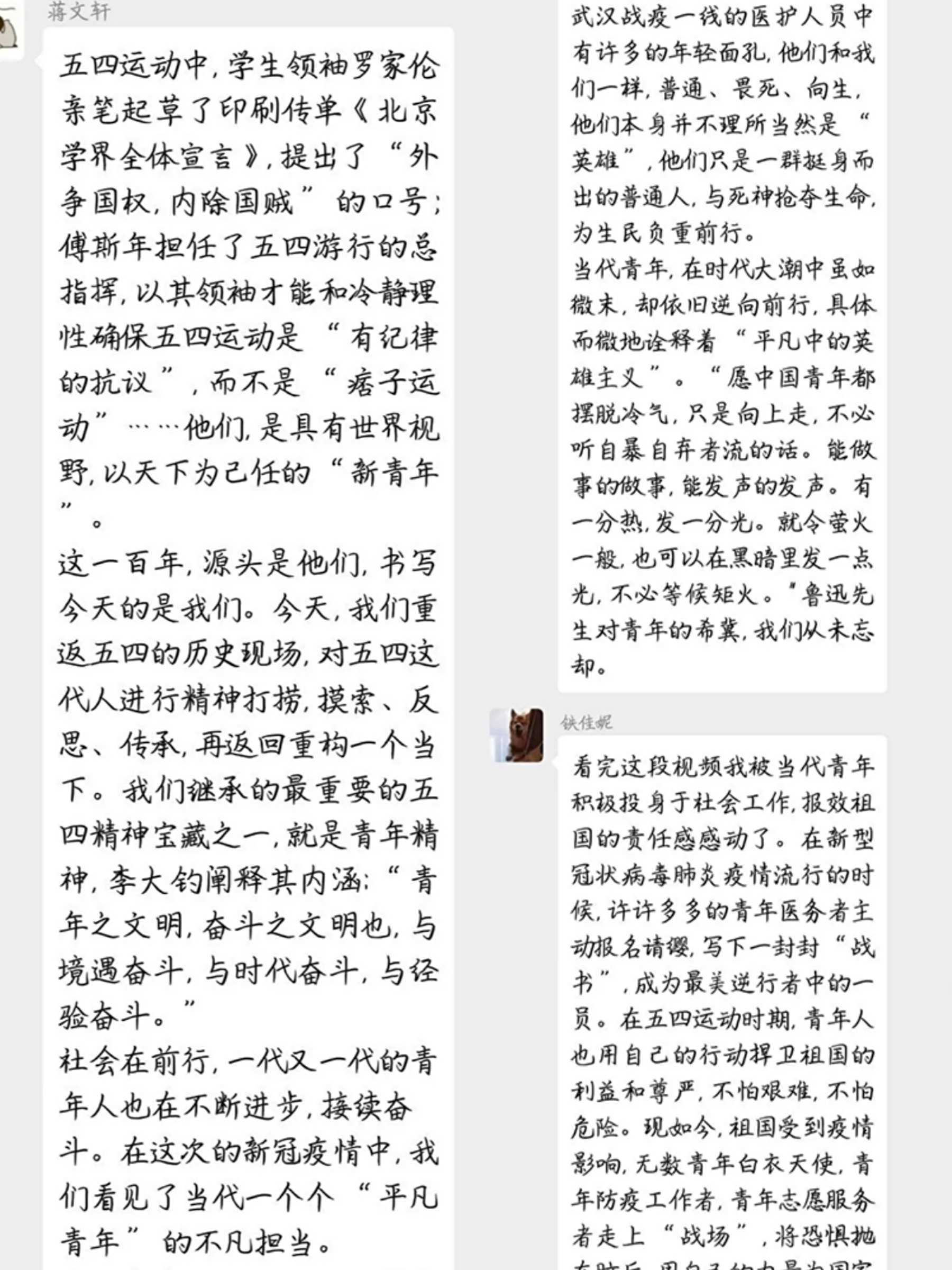 青年是整个社会力量中最积极、最有生气的力量,国家的希望在青年,民族的未来在青年。尽管五四运动已是百余年前,但它的光芒从未远去。百年前刘和珍、傅斯年、罗家伦等学生领袖拍案而起,以满腹爱国热忱肩担起反帝反封建的历史重任;一代人有一代人的长征路,源头是他们,书写今天的是我们:有曹园园、赵珺廷、武汉市东西湖区女大学生志愿者服务队等“00后”同亿万人民一道,奔赴在抗击新冠疫情的前线,在奉献自我、战胜疫情的实践中谱写青春华章。同学们在围绕主题讨论后更加理解“奋斗”这一古今青年共有的特点,以铿锵有力的字句赞美疫情期间的最美“逆行者”们,赞扬他们以平凡之躯铸就国泰民安。