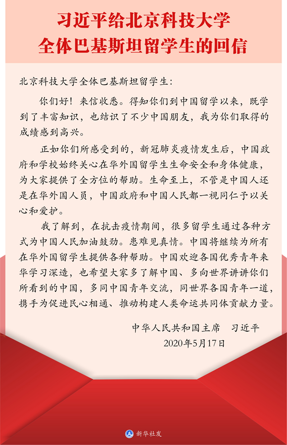 5月17日,中国国家主席习近平给北京科技大学全体巴基斯坦留学生回信,对各国优秀青年来华学习深造表示欢迎,鼓励他们多同中国青年交流,同世界各国青年一道,携手为促进民心相通、推动构建人类命运共同体贡献力量。以下是回信具体内容: