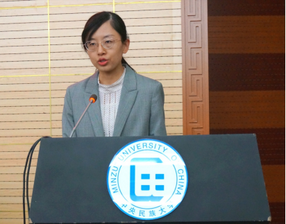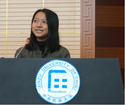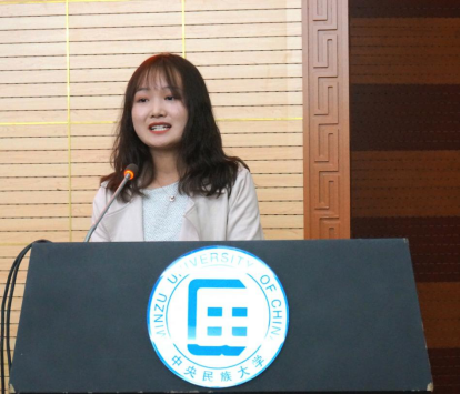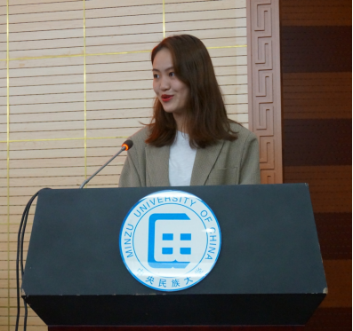 大会第三项,2020级硕士研究生代表牛琛淞同学分享了她初来民大的喜悦与激动,众赢国际