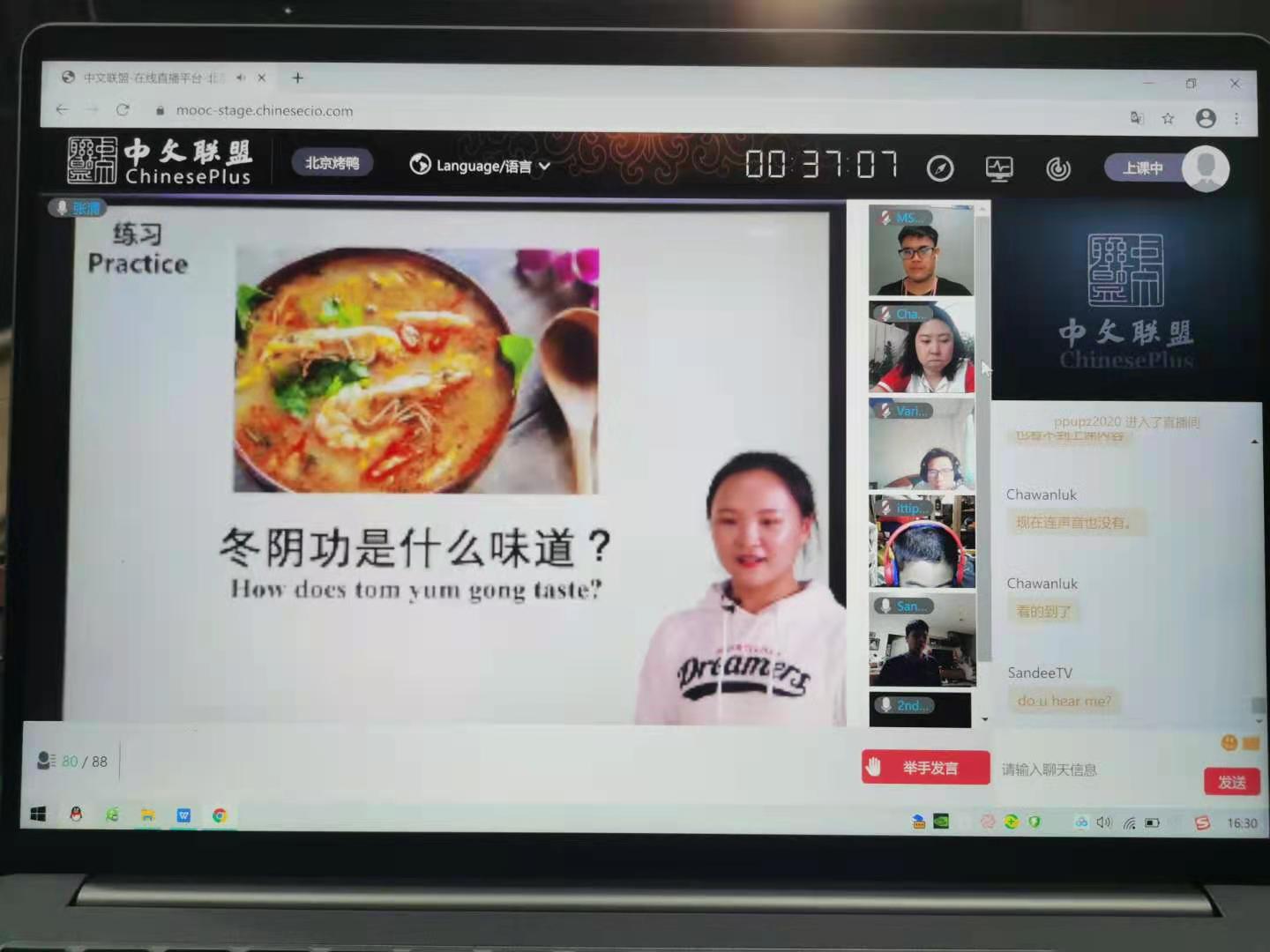 开营仪式结束后,同学们跟着老师“走进民大,走近中国”。老师重点介绍了北京、上海、成都、哈尔滨等城市文化,向学生展示了多样化的中国,激发了学生浓厚的兴趣。 接着老师用视频的方式向学生展示民大的留学生活。在介绍中国和民大的同时,教学生用汉语进行地理位置的表达、评价性描述以及连动句“想去哪里干什么”。在中国美食环节,老师帮助学生了解中国美食文化以及特色美食。将文化知识和语言技能相结合,让学生在探索中国美食的乐趣中学习语言。学习掌握与饮食相关的汉语常用语,并结合语言学习,使学生熟悉中国美食日常交际表达。课程围绕着交际中最常用、实用的词汇和语句展开,充满趣味性和实用性。