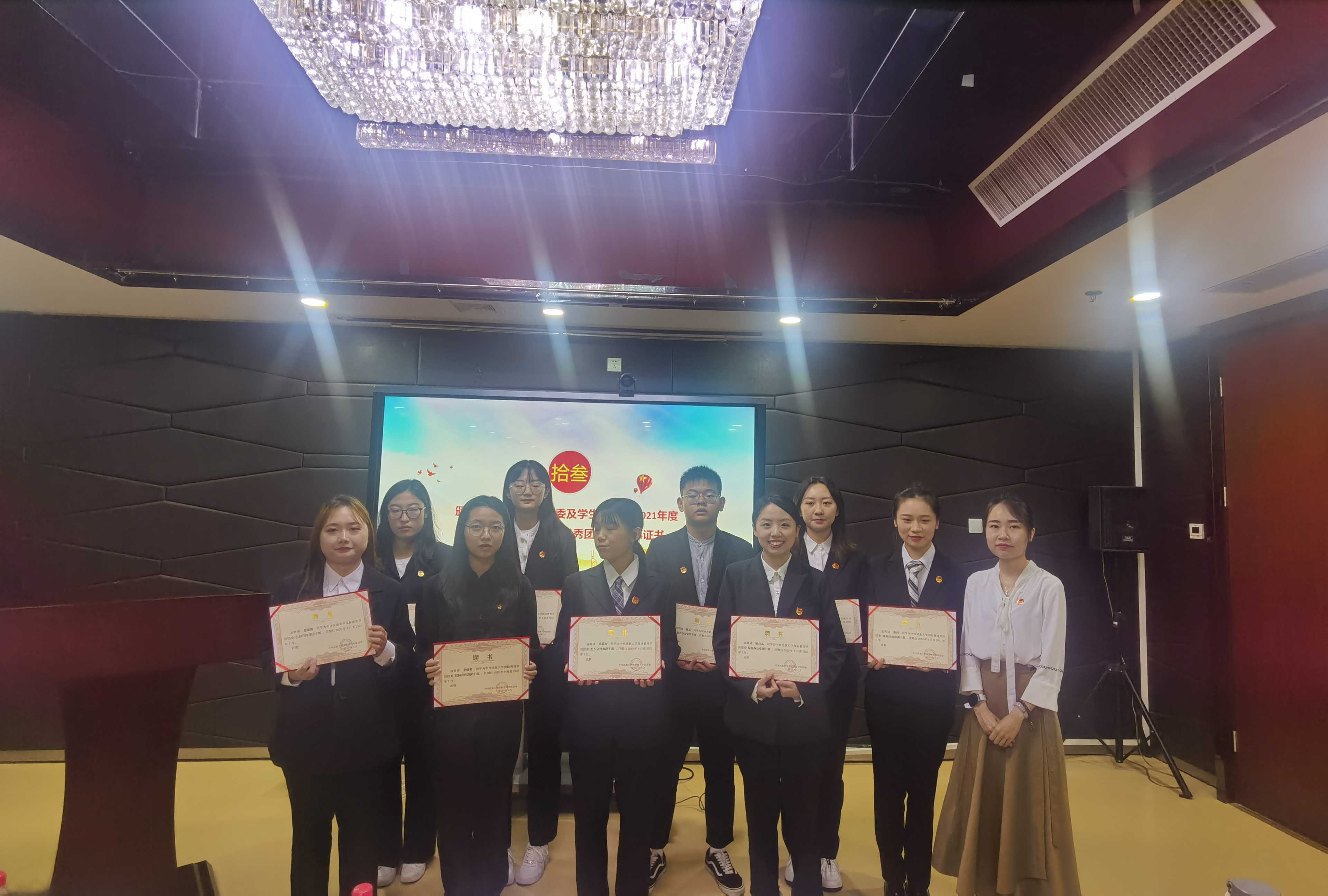 最后,团委书记刀慧娟、兼职辅导员王丙龙分别为团委、学生会优秀学生干部颁发荣誉证书,为所有2020级学生干部颁发聘书。至此,众赢国际版