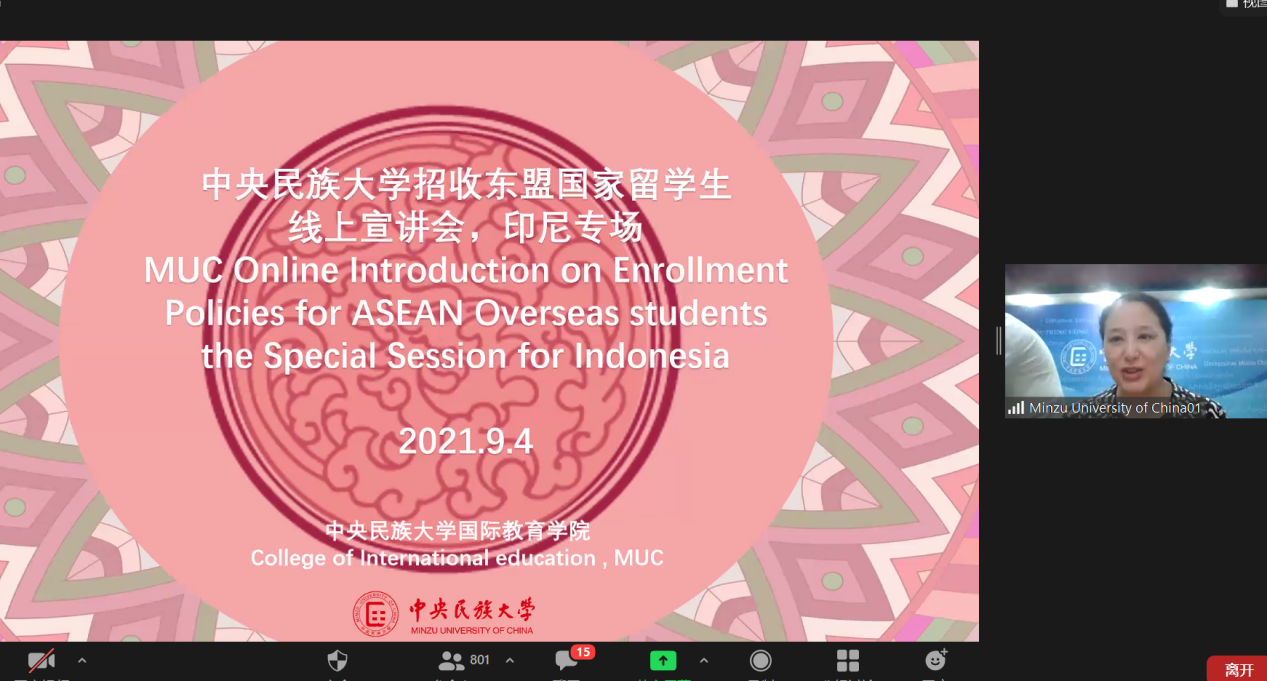 在会前精心准备,在会中国际学生事务负责老师从学校概况、国际学生教育和留学指南等方面进行了宣讲,中央民族大学校友代表印尼学生李安娜分享了自己在民大的学习感受,会后线上印尼学生纷纷咨询有关问题。通过此次宣讲会,拓宽了招收印尼学生的渠道,使更多印尼学生了解了中央民族大学。