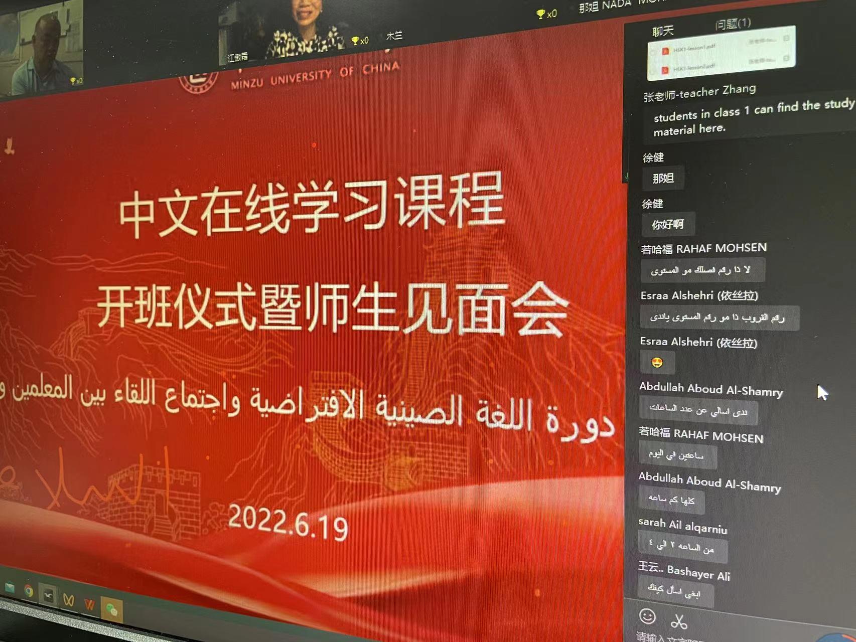 成功在线举办了“中文在线课程(沙特项目)开班仪式暨师生见面会”。副院长江傲霜和10位授课老师同来自沙特阿拉伯的89名学员参加了会议。会议由副院长兼党总支副书记李锷主持。
