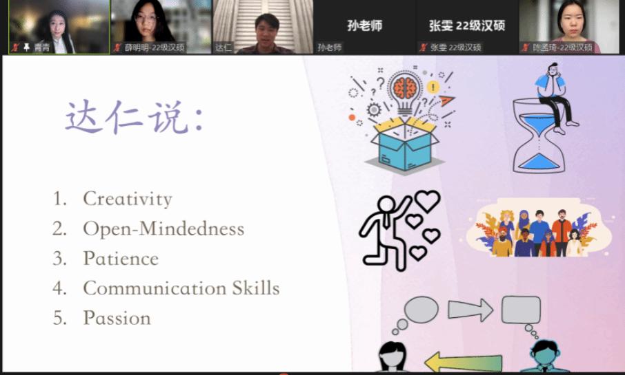 分享会中,青青介绍了她在民大和美国的学习、实习及工作经历,结合自己的亲身经历与体会,鼓励大家尽可能利用在校资源,夯实基础知识,珍惜实操机会,多参与实习及比赛活动,积累经验,提升自身能力。达仁分享了他心目中优秀老师是什么样的,也详细阐释了一位有着“Creativity, Open-Mindness, Patience, Communication skills, Passion”的教育者对学生的重要性。最后在提问答疑环节,青青和达仁就同学提出的诸如美国就业形势、岗位类型、薪资待遇、生活状况等问题,进行了细致耐心的解答。