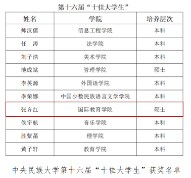 2021级硕士研究生张齐红荣获中央民族大学第十六届“十佳大学生”荣誉称号。