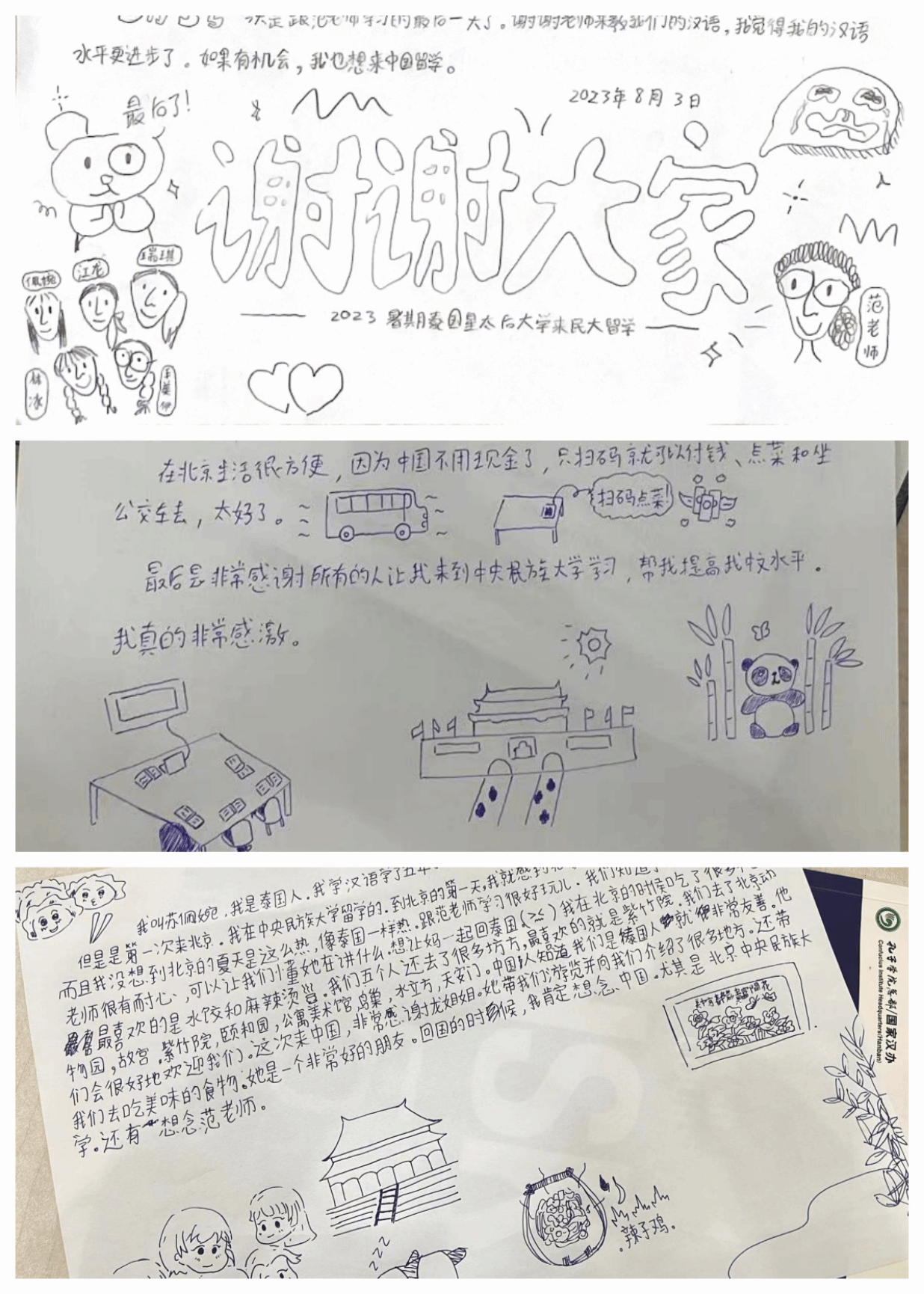 在结业仪式上,同学们纷纷用中文发言,畅谈自己的学习感受。苏佩婉同学说:“学习汉语五年了,第一次来北京,来中央民族大学学习跟老师学到了很多新词,老师很有耐心。回国以后肯定会想念中国,想念中央民族大学”;孙瑞琪同学说她是第一次来中国,中央民族大学校园很漂亮,出入校门刷脸太有安全感了;王美伊同学说:“虽然在民族大学的留学时间非常短暂,但这段留学生活带给自己许多美好而难忘的回忆,学到了很多新知识,口语和阅读进步很大”;李江龙同学说:“这一个月去了好多地方参观,品尝了好多的中国美食,希望有机会再来中央民族大学读研究生”;林冰同学觉得在中国学习的时间过得很快,和老师一起去了很多地方,了解到更多的中国历史,选择学习汉语是选对了,希望再来中国学习。