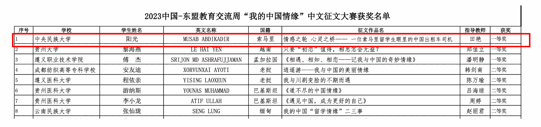 2023年7月15日至9月20日,2023中国-东盟教育交流周中文征文大赛圆满落幕。本次征文大赛以“我的中国情缘”为主题,面向全国高校来华留学生征集征文。包括中央民族大学、北京语言大学、广西师范大学、重庆大学等高校在内的15个国家的几十件来华留学生优秀作品参与此次活动评选。最终,经过专业评审,我校国际学生阳光(MUSAB ABDIKADIR)脱颖而出,荣获本次征文大赛一等奖第一名,田艳副教授荣获优秀指导教师奖。