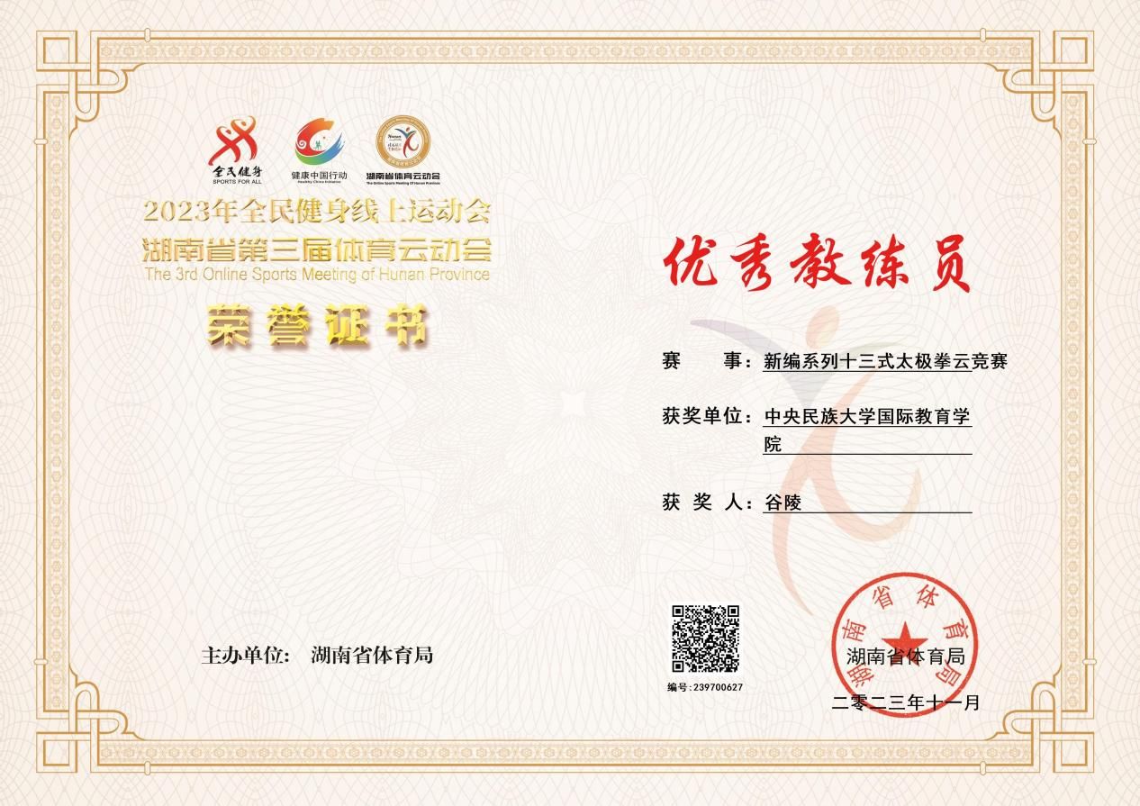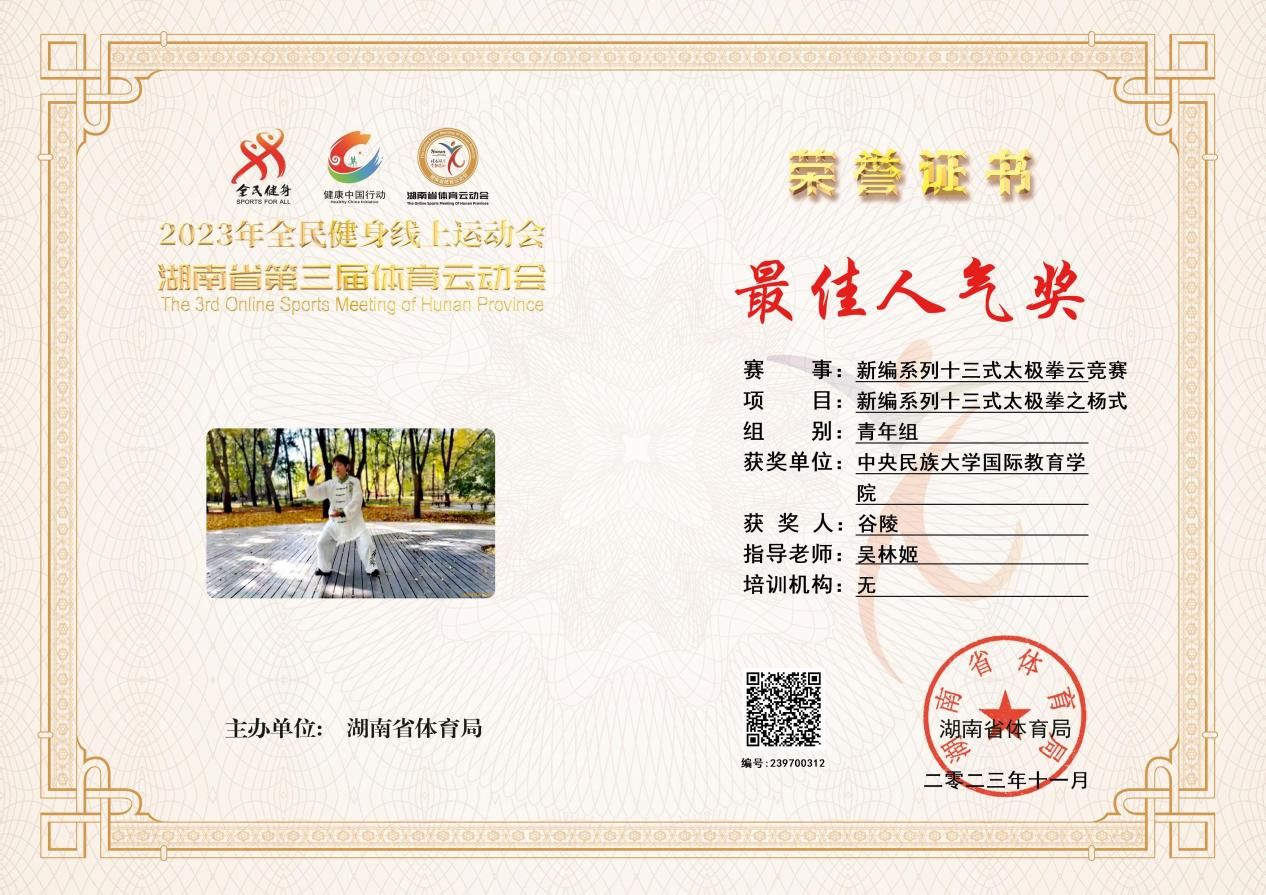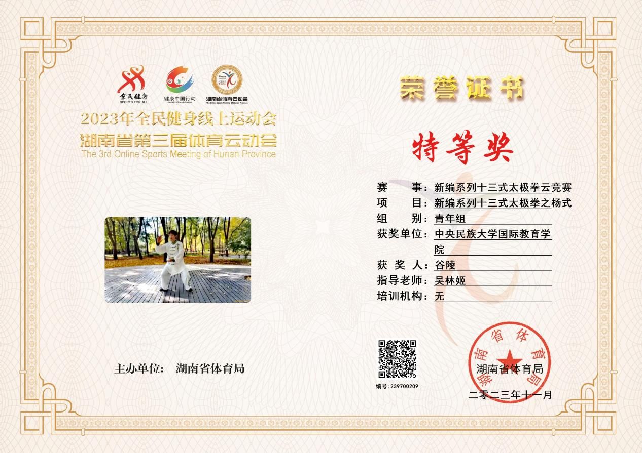 组建了一支太极拳队伍,由任课教师谷陵带队,报名参加了四个个人项目和一个集体项目,其中个人项目中缅甸留学生赵帅荣获青年组一等奖,教师谷陵荣获青年组特等奖和最佳人气奖,获评最佳教练奖。