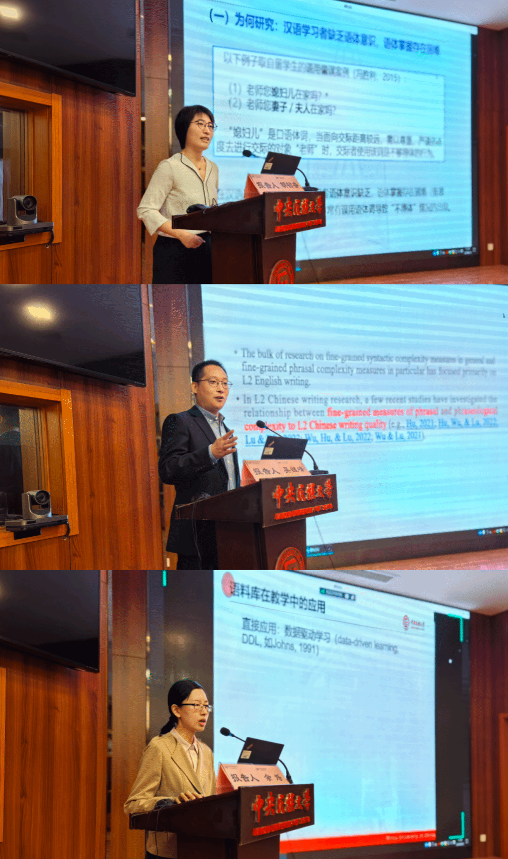 胡韧奋副教授的报告《现代汉语词汇语体属性探测模型研究》立足于正式-非正式的语体维度,提出了基于机器学习方法的现代汉语词汇语体属性探测模型。吴继峰教授的报告"Noun Phrase Complexity and Second Language Chinese Proficiency: An Analysis of Narratives by Korean Learners of Chinese"探讨了汉语母语者和不同语言水平的韩国汉语二语学习者在名词短语复杂性和特定类型的短语修饰语使用方面的差异,并对汉语写作教学提出了建议。余烁副教授的报告题为《基于数据驱动学习的汉语二语者动结式习得研究》,探究了汉语二语者在学习汉语动结式时数据驱动学习的影响,以及索引材料的使用策略,研究发现直接使用语料库有助于汉语二语者动结式学习成绩的提升。