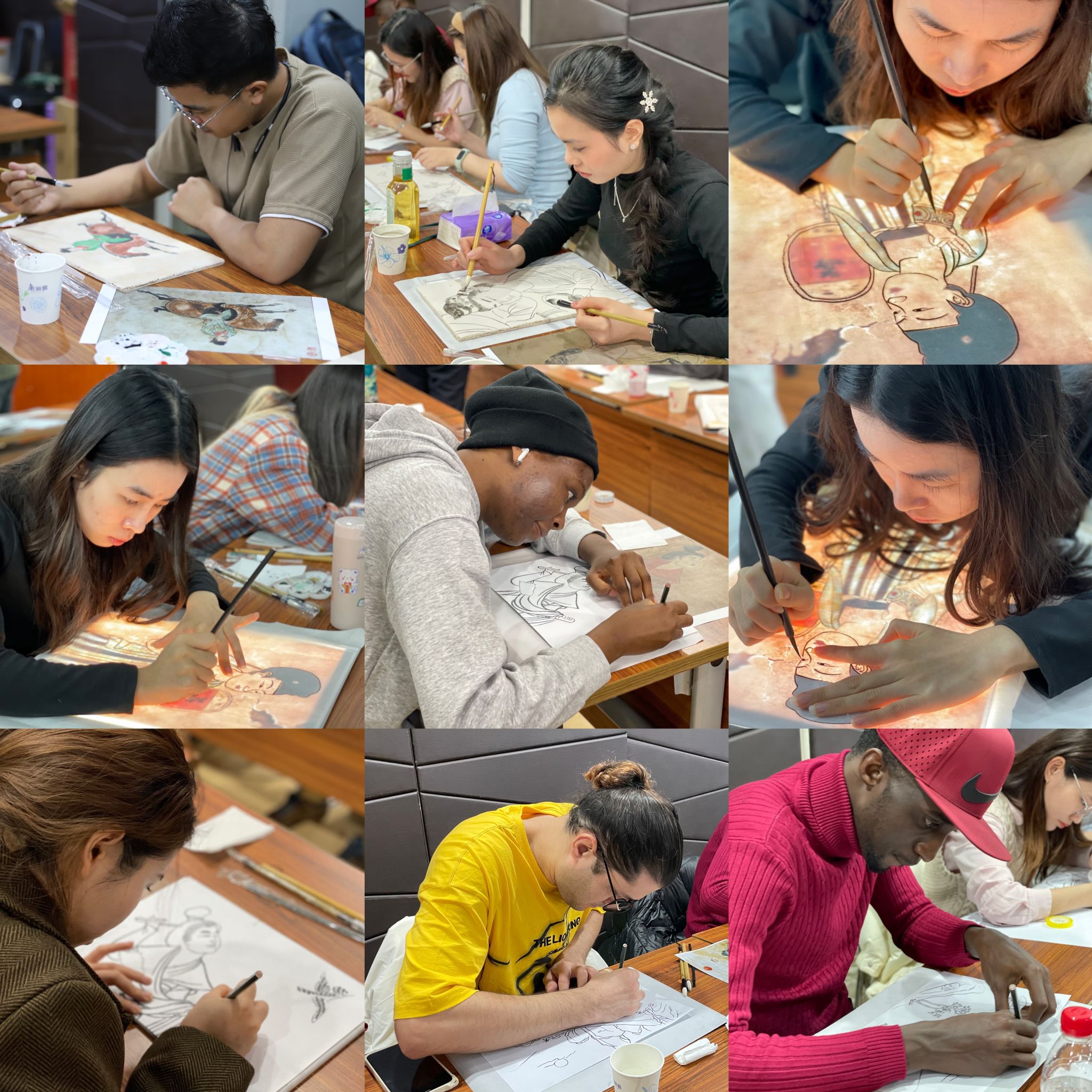 在传统临摹实践环节,同学们拿起画笔,亲身投入到唐代壁画的临摹过程之中。通过壁画专家们手把手的指导,同学们从线条勾勒到色彩填充,每一步都凝聚着专注与热情。经过两个多小时的努力,一幅幅充满创意与活力的唐代壁画作品在国际学生的笔下诞生。本次唐代壁画临摹体验活动,不仅是对古代技艺的传承,更是中华文化跨越时空、跨越国界的生动展现与传承。
