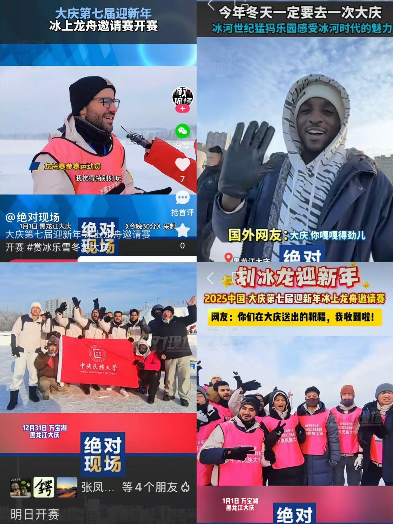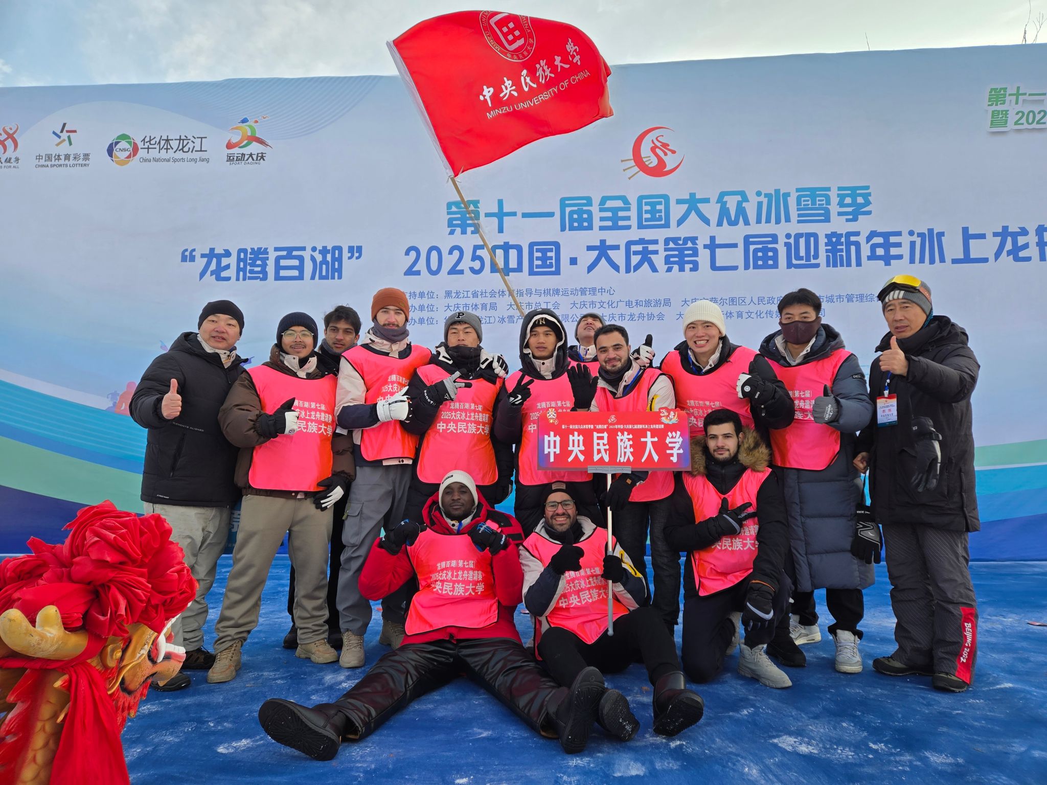 新年伊始,由我校12名中外学生组成的中央民族大学国际冰上龙舟队应邀参加了第十一届全国大众冰雪季“龙腾百湖”2025中国·大庆第七届迎新年冰上龙舟邀请赛,队员们在比赛中充分展现了民大学子的青春风采,也促进了中外文化的交流与融合。