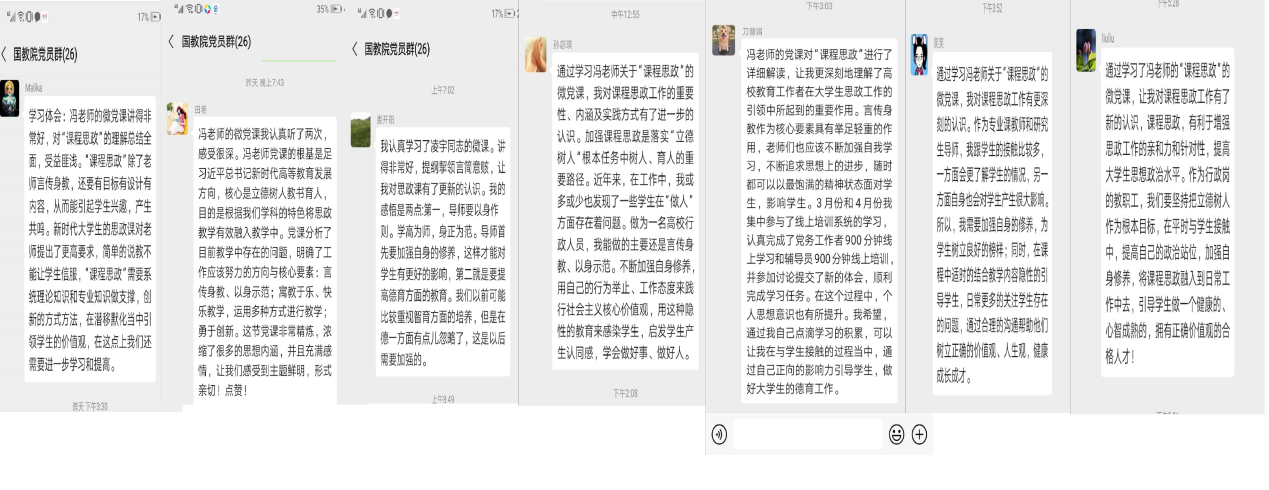 各位教工党员同志纷纷表示,通过微课认识到“课程思政”不是“思政课程”,但“课程思政”却在育人方面发挥着重要的作用。大家认识到加强课程思政正是高校落实“立德树人“根本任务中树人、育人的重要路径,并进一步明确了工作应该努力的具体方向与核心要素,即:言传身教、以身示范;寓教于乐、快乐教学,运用多种方式进行教学;勇于创新,改革教学设计等。新时代对教师提出了更高要求,“课程思政”不仅需要教师有系统理论知识和专业知识做支撑,更需要教师用自己的行为举止、工作态度、仪态仪表来践行社会主义核心价值观,用隐性的教育来感染和启发学生学会做好事、做好人、做好学问,在潜移默化当中引领学生树立正确的价值观和人生观。