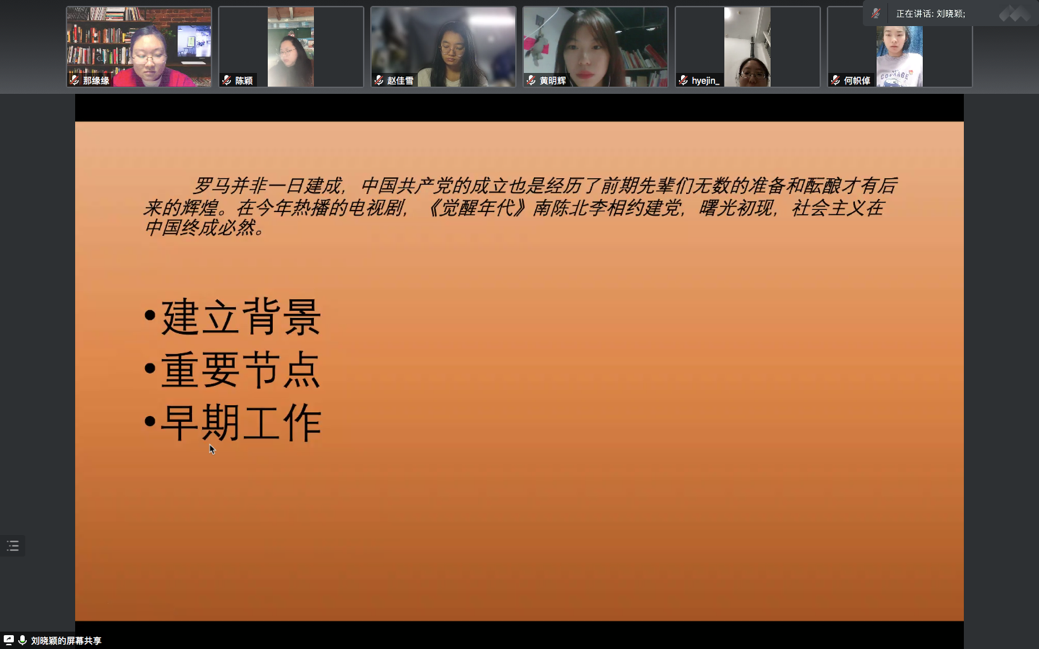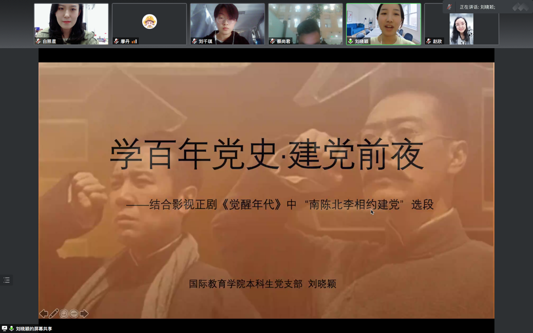 本科生党支部在线上开展了第四次“党员讲党课”系列学习活动。第四讲的主题为“学百年党史·建党前夜”。党课由支部书记白照星同志主持,由支部党员刘晓颖同志主讲,众赢国际版