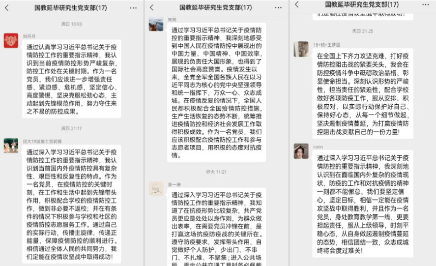 在疫情防控期间,每个党员都应严格遵守学校防疫的各项规定、配合学校疫情防控工作。传播主旋律、传播正能量,不信谣、不传谣、不造谣。