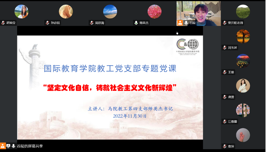 教工党支部党员从实践出发,分享了文化语言活动、语言文化课堂教学、对外交流中的具体文化传播路径以及怎样培养中国学生的家国情怀、国际学生对中华文化的认同与中国情怀等内容。