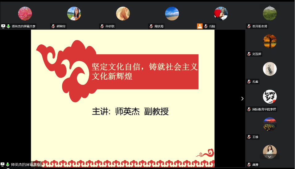 师英杰老师以“坚定文化自信,铸就社会主义文化新辉煌”为题,阐述了文化自信的重要作用和深刻内涵。文化自信是民族复兴的基础和标志,师老师从马克思主义哲学角度对文化、文化自信的定义进行了解读,基于历史眼光与新时代精神视角,阐释了文化自信的内容与性质,分享了对中国文化传播、中国文化影响力的思考与理解。