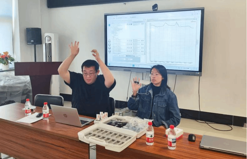 首先,纪德宇工程师围绕皮肤电仪器的工作原理与操作流程进行了系统讲解。他现场展示了皮肤电测量设备,并演示了如何连接设备、设置参数、采集分析数据。在实操环节,工程师邀请两名同学上台参与实验,现场测试了皮肤电、心率等生理指标,让师生直观了解了设备的工作过程和数据采集方式。