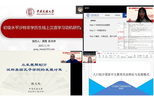 2020级博士生龚漫与陈天序副教授合作报告了《初级水平沙特非学历生线上汉语学习动机研究》,2021级硕士覃可、李若琳、王艺在刘玉屏教授的指导下,进行了题为《国际中文教师与外语专业中文志愿者专业身份建构对比研究》的汇报,引起在场专家学者的关注和讨论。