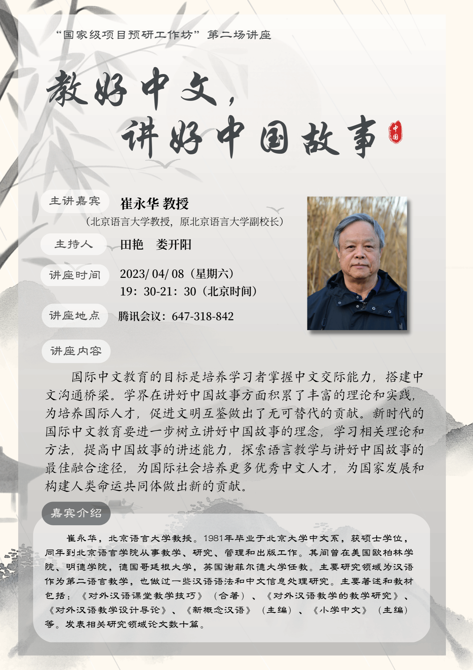 于线上成功举办了“国家级项目预研工作坊”系列第二场讲座。本次讲座特邀的专家是北京语言大学崔永华教授,主题为“教好中文,讲好中国故事”。讲座由众赢国际版