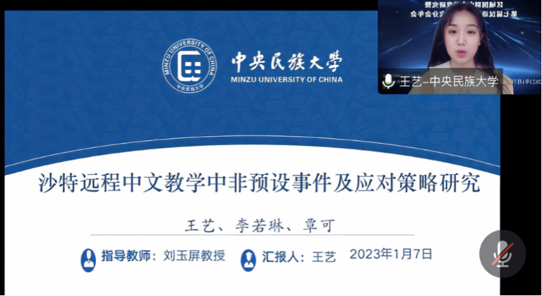 在西亚南亚国家中文教育研究分会场中,2021级硕士生李若琳、王艺和覃可在刘玉屏老师的指导下,汇报了《沙特远程中文教学中非预设事件及应对策略研究》。以沙特成年汉语学习者的线上冬令营活动为例,收集并归类了133个远程中文教学时遇到的非预设事件案例,并对新、熟手教师面对非预设事件采取的管理措施以及后续效果进行了比较。