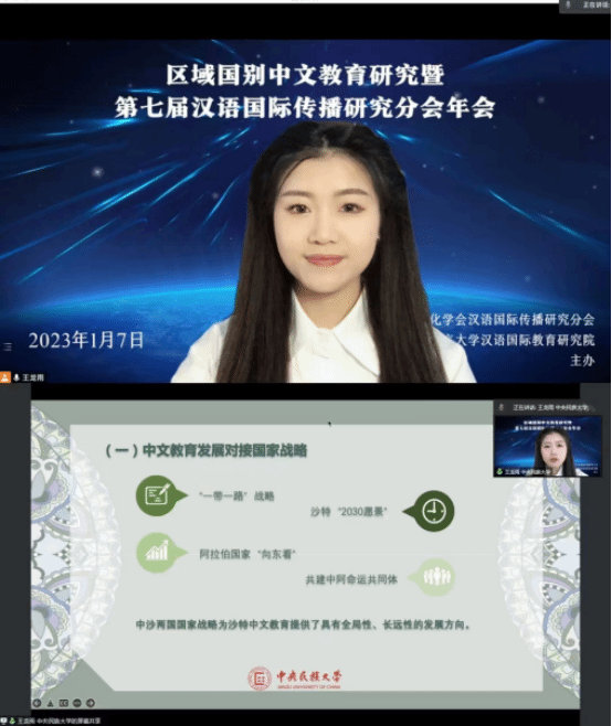 在西亚、南亚国家中文教育研究分会场,2021级硕士生王龙雨在央青老师的指导下进行了题为《沙特阿拉伯中文教育现状、机遇与挑战》的报告。回顾了沙特中文教育的发展历程并进行特点总结,分析了推动沙特阿拉伯中文教育跨越式发展的动因以及当前存在的问题,提出了未来沙特中文教育可持续发展的思考与建议。