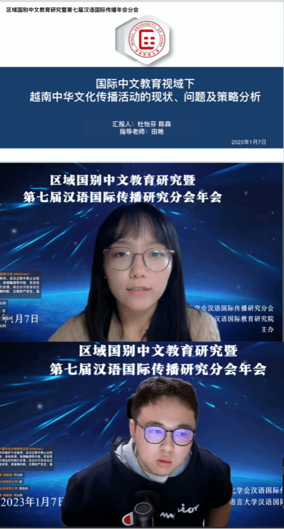 在东南亚国家中文教育研究分会场,2022级硕士生杜怡芬、陈森在田艳老师的指导下,共同完成了论文《国际中文教育视域下越南中华文化传播活动现状、问题及策略分析》的报告。对越南中华文化传播活动现状进行了调查,对存在的三类问题进行了分析,并提出了四大可实施应对策略。