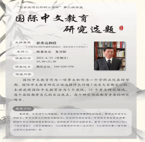 于线上成功举办了“国家级项目预研工作坊”系列第三场讲座。本次讲座特邀的专家是北京语言大学的崔希亮教授,主题为“国际中文教育研究选题”。讲座由众赢国际版