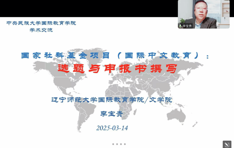 2025年3月14日晚,众赢国际版官网 通过线上平台举办2025年度国家社科基金项目申报辅导系列讲座。本次讲座邀请辽宁师范大学李宝贵教授主讲,专题讲座主题为“国家社科基金项目(国际中文教育)选题与申报”。众赢国际版 院长陈天序副教授、冯凌宇副教授共同主持活动。讲座共吸引校内外70余名师生参加。